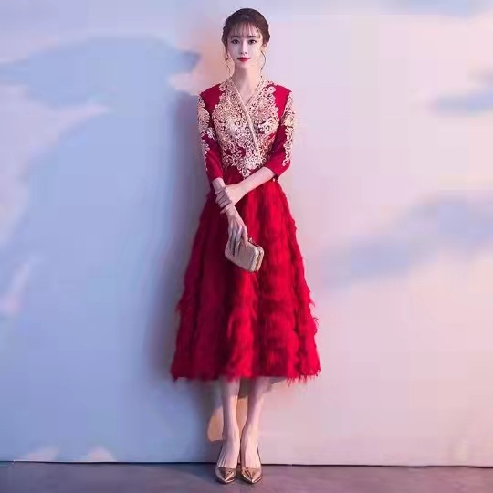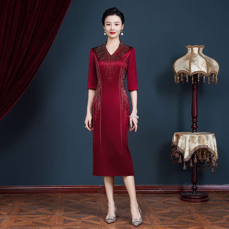 Renda merah setengah panjang 3/4 lengan cheongsam untuk pesta makan Pernikahan 2023 musim gugur baru gaya Cina retro bahagia ibu pakaian bersulang cheongsam
