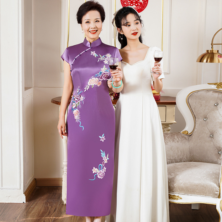 High-end gaun pernikahan ibu musim panas asetat Taro ungu bordir Cheongsam modis happy mother-in-law toast dress 22D68