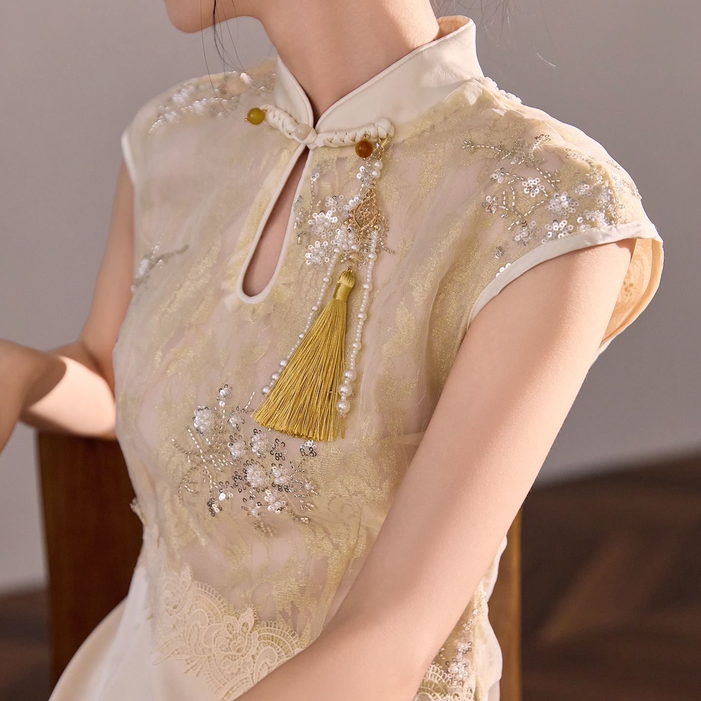 Gaun bordir renda gaya Cina untuk wanita bertubuh mungil, gaun cheongsam gaya Cina baru yang ditingkatkan kelas atas model ZX N3111