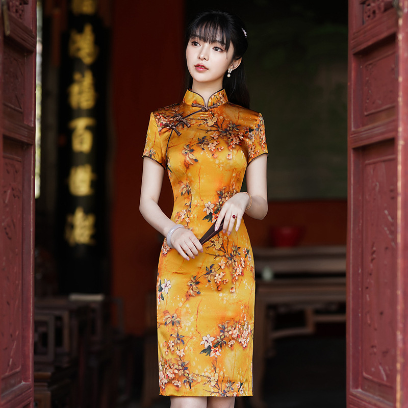 Penjualan habis stok: Gaun cheongsam panjang modifikasi lengan pendek sutra murbei gaya baru musim semi 10736.
