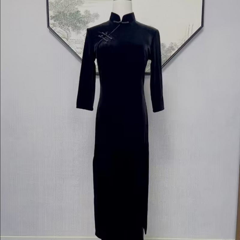 Gaun Retro Cheongsam Warna Polos Beludru Emas Elegan Mulia Model Baru Musim Semi dan Musim Gugur Rok Bercabang Terlihat Langsing Membentuk Pinggang