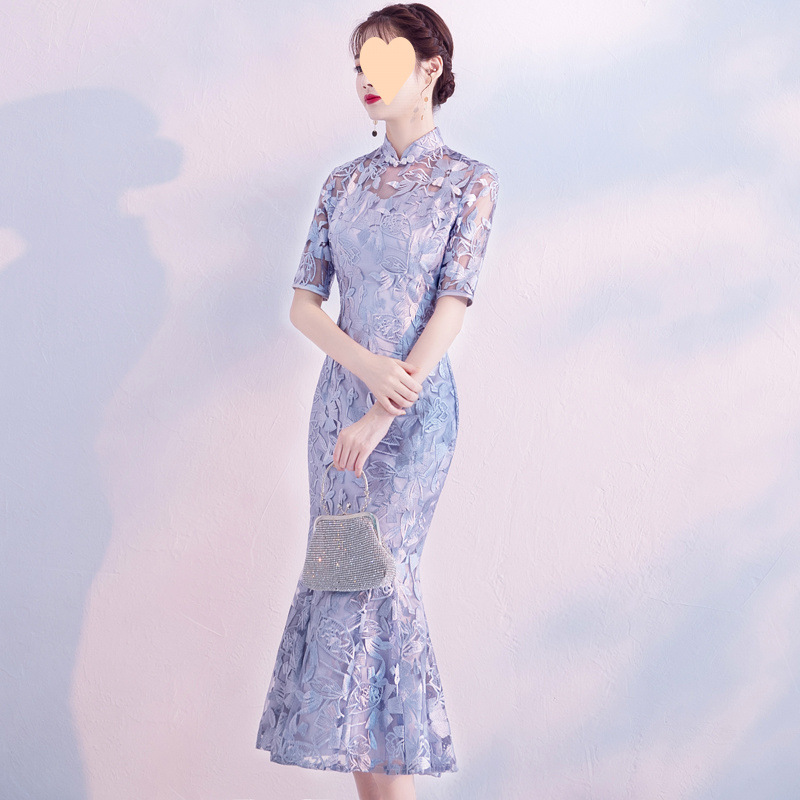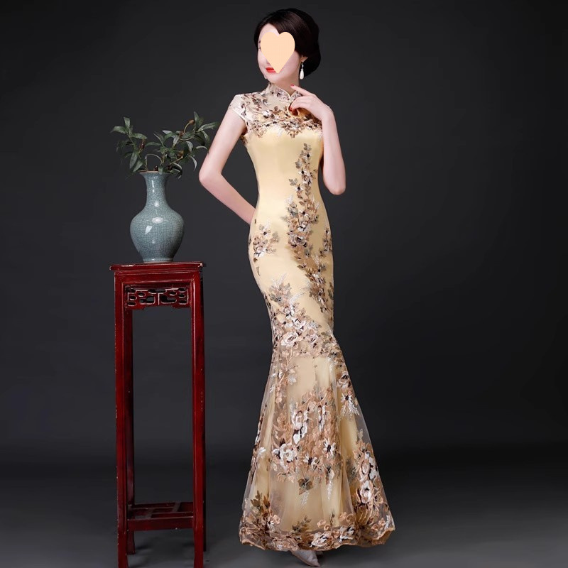 Cheongsam Gaun Gadis Muda Versi Modifikasi Ekor Ikan Model Panjang Sedang Gaun Pertunjukan Perjamuan Gaya Tiongkok Terlihat Langsing Wanita
