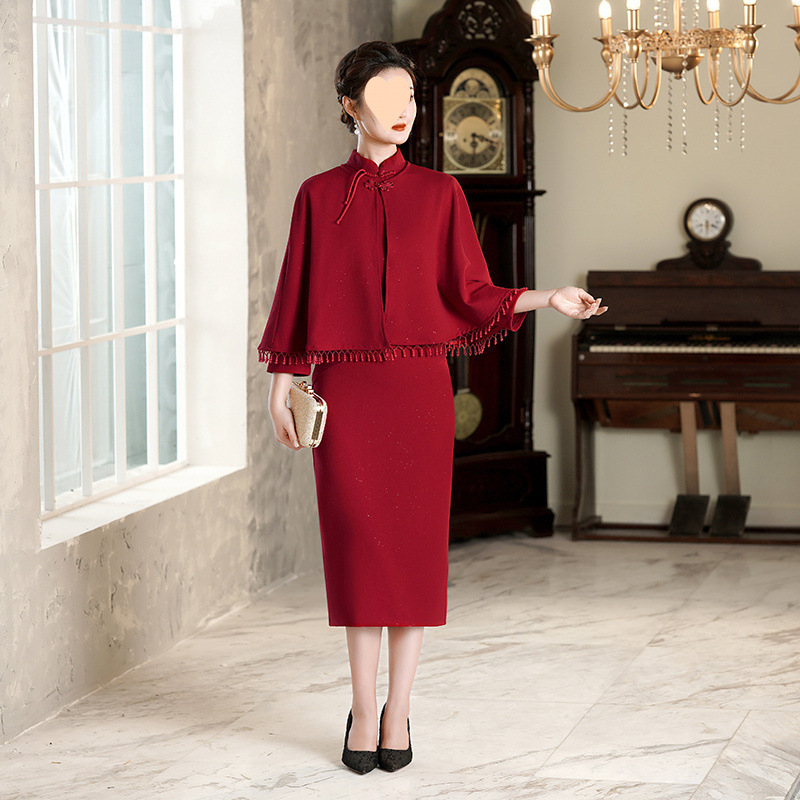 Cheongsam, Ibu mertua muda merah, pakaian ibu mertua, pakaian ibu mertua, pakaian musim gugur lengan panjang, gaya Cina, set dua potong