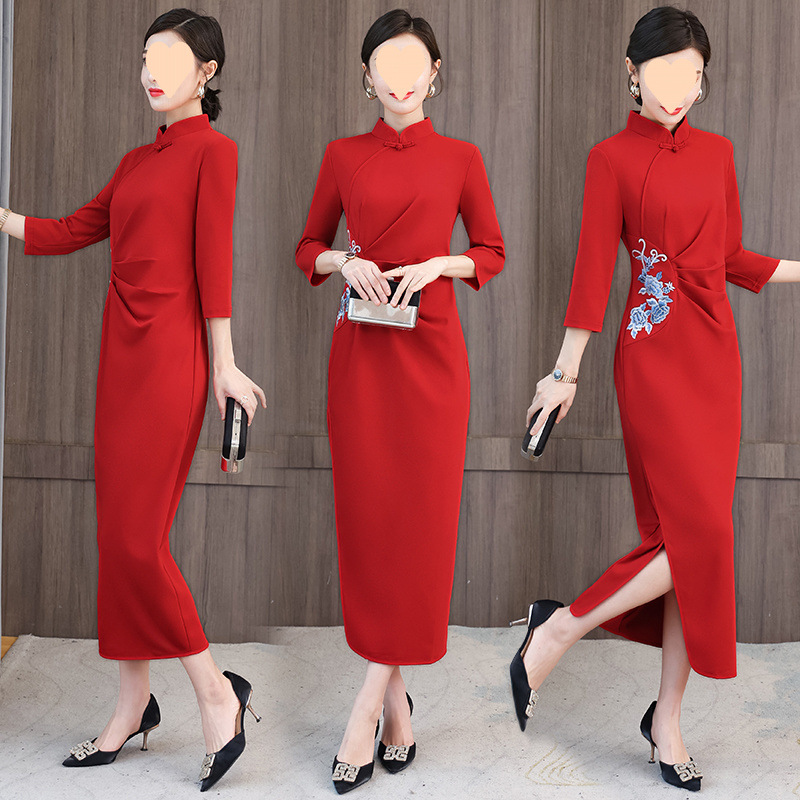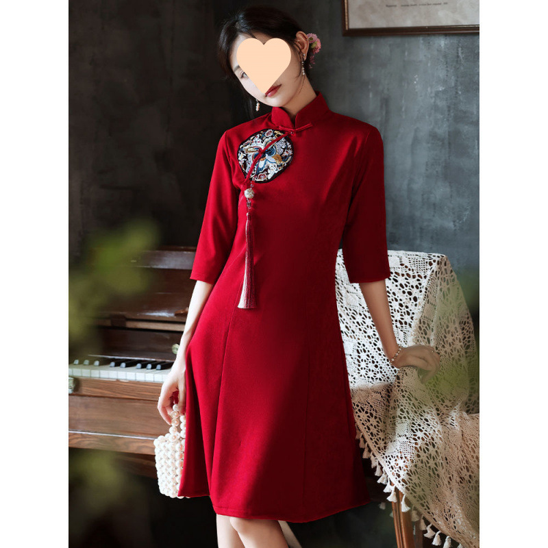 Cheongsam Modifikasi Model Baru Musim Semi 2025 Pakaian Bersulam Bordir Lengan 3/4 Meriah Merah Gaun Pendek Pinggang