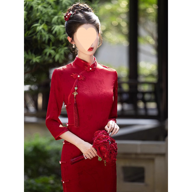 Cheongsam Merah Pakaian Bersulang Model Baru Tahun 2025 Lengan Panjang Elegan Model Muda Gaun Pertunangan Pernikahan Pengantin Wanita Musim Gugur