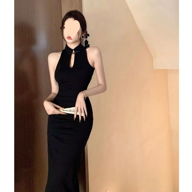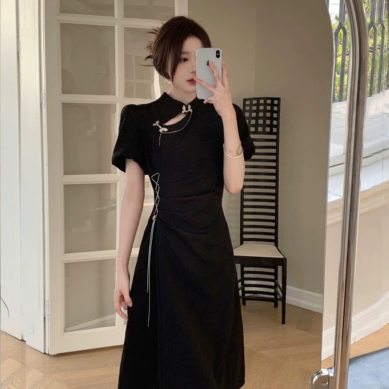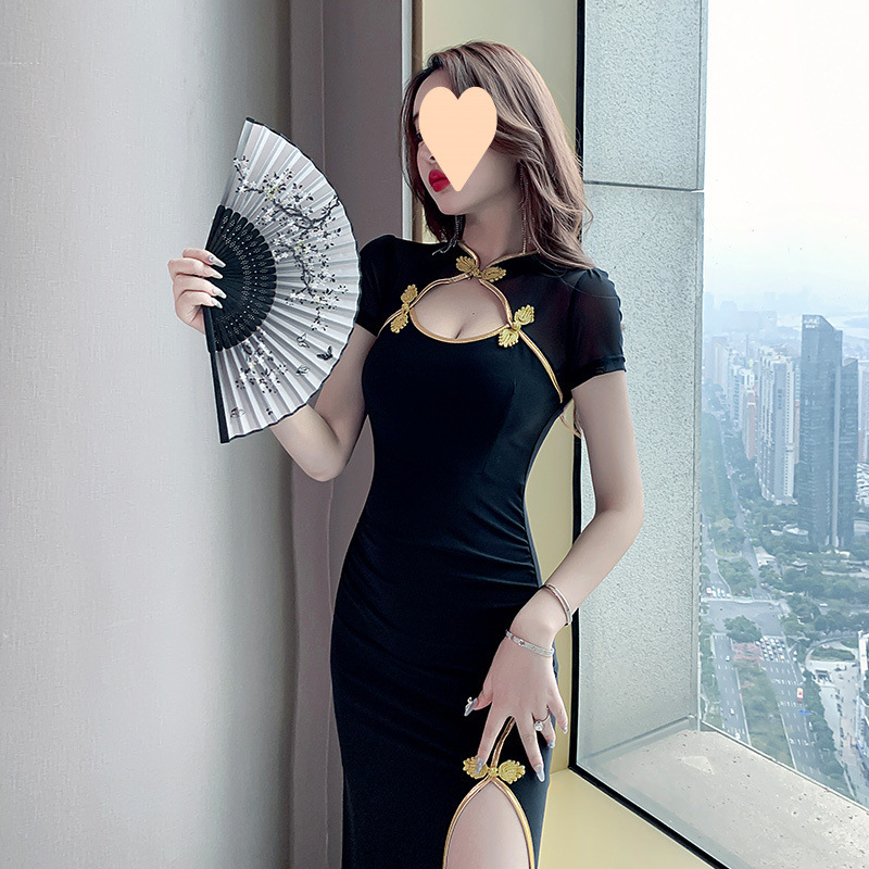 Gaun Cheongsam Modifikasi Gaya Tiongkok Baru Gaya Republik Cina Susun Pinggul Wanita Gaun Malam Hitam Berongga Ketat Musim Panas
