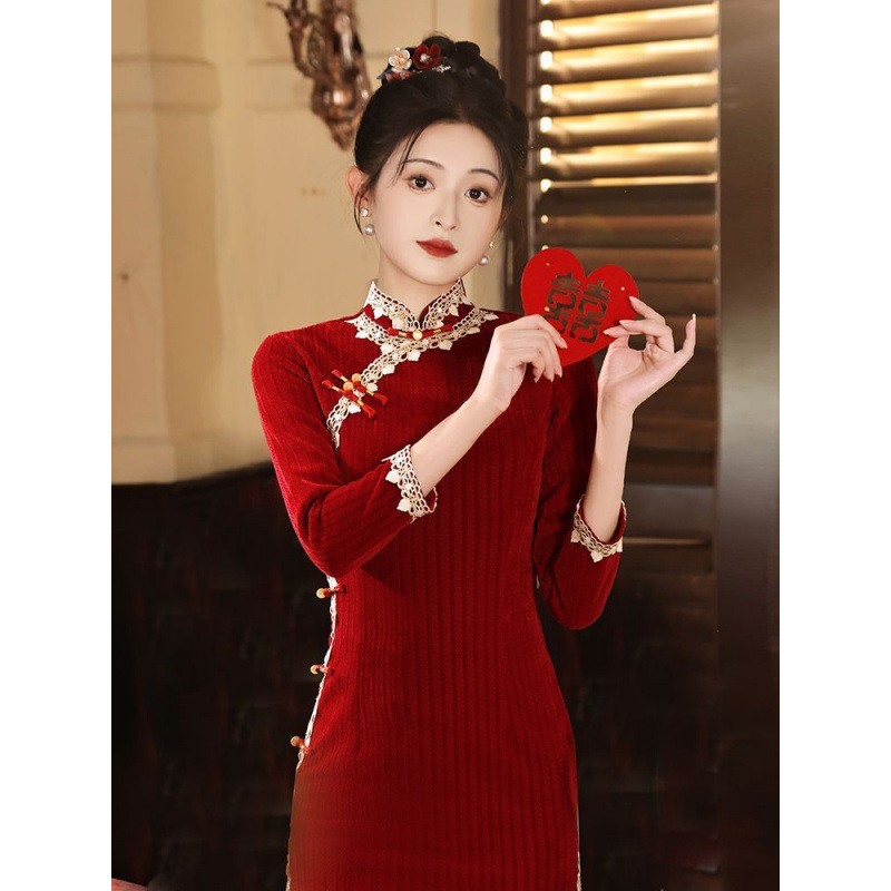 Cheongsam Gaya Tiongkok Baru Set Musim Gugur dan Musim Dingin Model Baru 2025 Gaun Pertunangan Warna Merah yang Bisa Dipakai Sehari-hari Elegan Gadis Gaya Baru Musim Semi Gaya Nasional