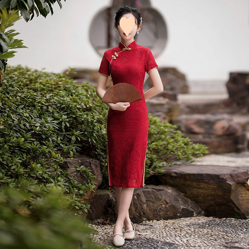 Cheongsam Renda Model Baru Tahun 2025 Pakaian Bersulang Panjang Sedang Warna Merah Anggur Wanita