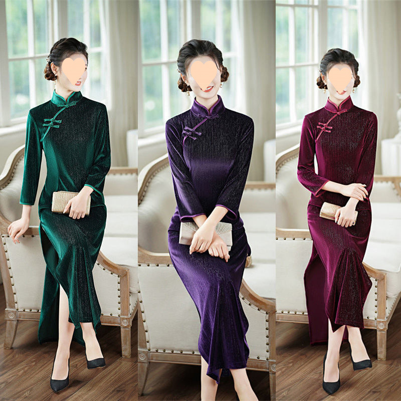 Gaun Beludru Emas Cheongsam Kelas Atas 50-60 Gaya Barat Pakaian Ibu Pernikahan Musim Semi dan Musim Gugur Model Baru Rok Panjang Bordir Bunga