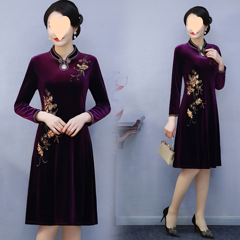Rok Cheongsam Versi Modifikasi Lengan Panjang Musim Semi dan Musim Gugur 2025 Rok Reproduksi Setengah Baya Gaun Ibu Terlihat Langsing Di Bawah Lutut Wanita