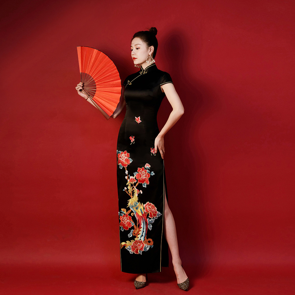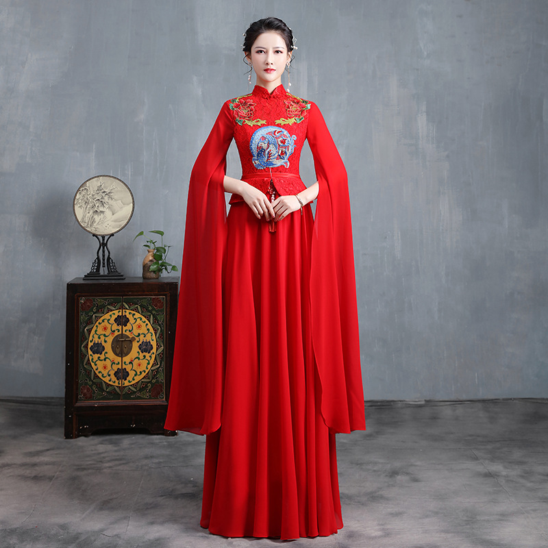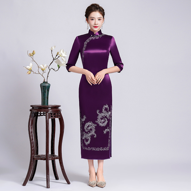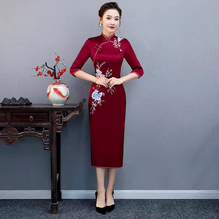 Gaun cheongsam bordir panjang menengah 2019 baru musim gugur dan musim dingin satin asetat pernikahan musim gugur pernikahan 1960