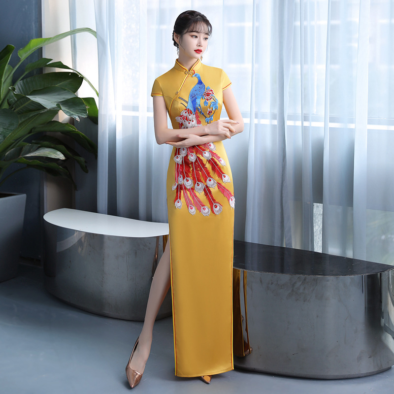 Gaun malam cheongsam panjang 2025 warna emas dengan pola bordir merak, gaun pertunjukan wanita yang melangsingkan, gaya retro artistik.