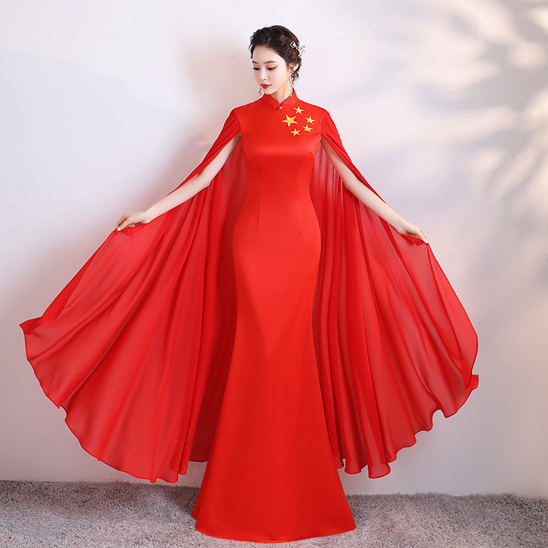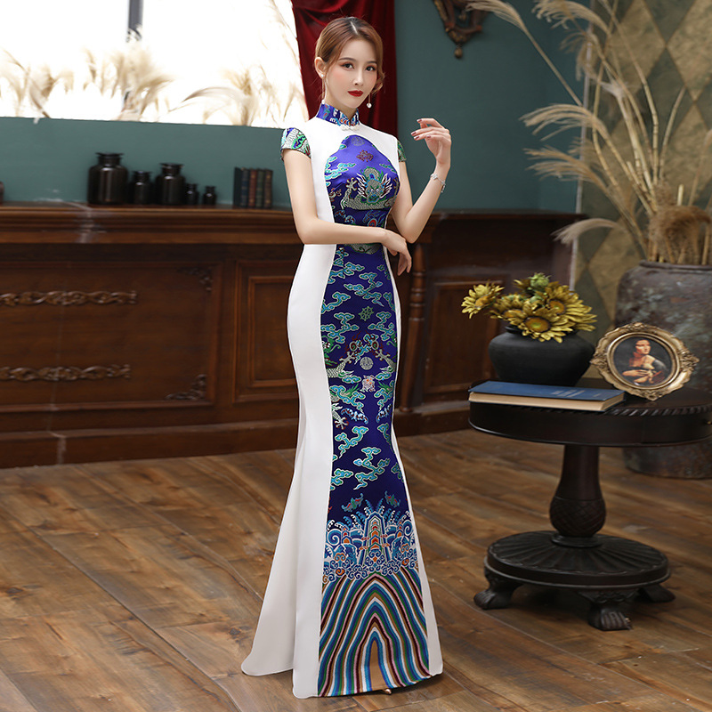 2021 baru catwalk busana cheongsam ekor ikan dimodifikasi gaun retro kerah berdiri kostum paduan suara paruh baya