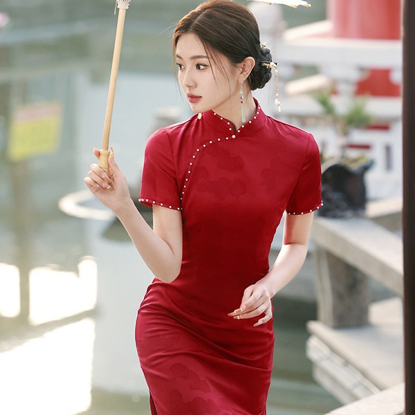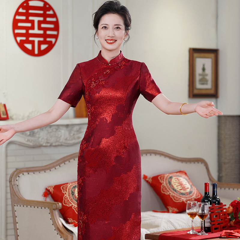 Cheongsam Model Baru Musim Panas Gaya Tiongkok Modifikasi Anggur Merah Ibu mertua Cheongsam Pakaian Retro Ibu Terlihat Kurus Ramping Pakaian Bersulang