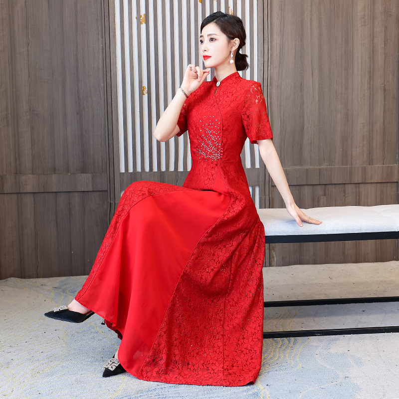 Gaun cheongsam renda yang ditingkatkan, Gaun wanita musim panas 2021, gaun pernikahan retro kerah berdiri, gaun panjang ibu
