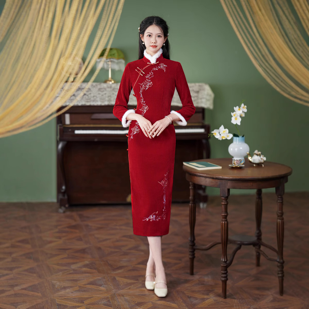 Gaun Cheongsam merah musim dingin wanita baru 2023 gaun bersulang pengantin dipertebal lengan panjang gaya nasional gaun ucapan Tahun Baru