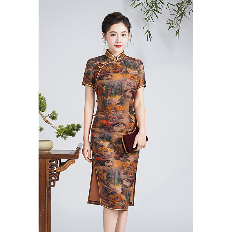 Gaun cheongsam panjang sedang, 2022 musim semi dan musim panas peregangan empat sisi gaun cheongsam anak perempuan gaya China ramping catwalk