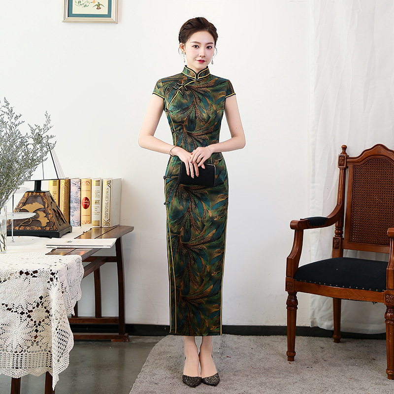 Gaun cheongsam sutra jacquard meriah baru 2021 gaun jamuan makan modis panjang sedang lengan pendek grosir