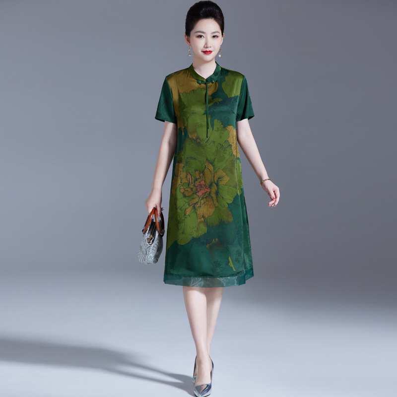 Gaun sutra wanita paruh baya dan lansia, gaun cheongsam baru gaya nasional ibu sutra murbei baru musim panas ukuran besar