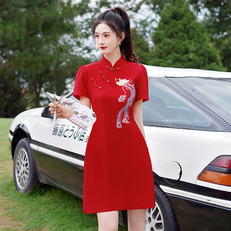 国潮刺绣修身显瘦改良旗袍2024夏季新款年轻款喜庆红色连衣裙