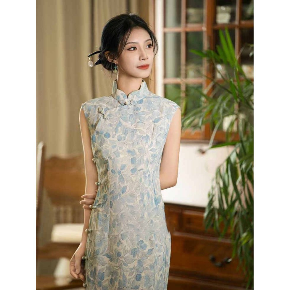 Green Wine Song | Cheongsam Retro Gaun Terlihat Langsing Putih Model Baru Gaya Tiongkok Baru Musim Panas Tanpa Lengan Sehari-hari Wanita