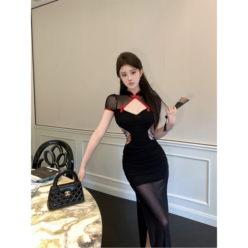 性感立领镂空网纱连衣裙2024夏季新款名媛绣花修身旗袍女装铅笔裙