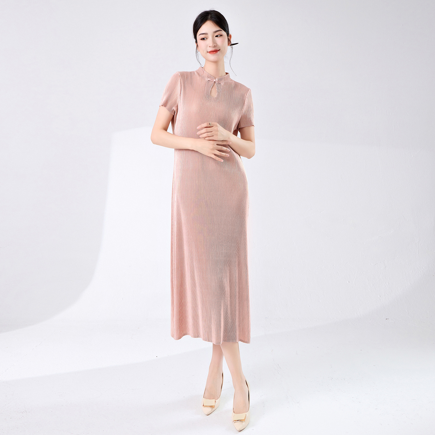 Cheongsam gaya Cina baru, versi yang ditingkatkan, desain baru yang modis, kerah tegak, lengan pendek, belahan, panjang sedang, gaya nasional, gaun gaya Miyake.