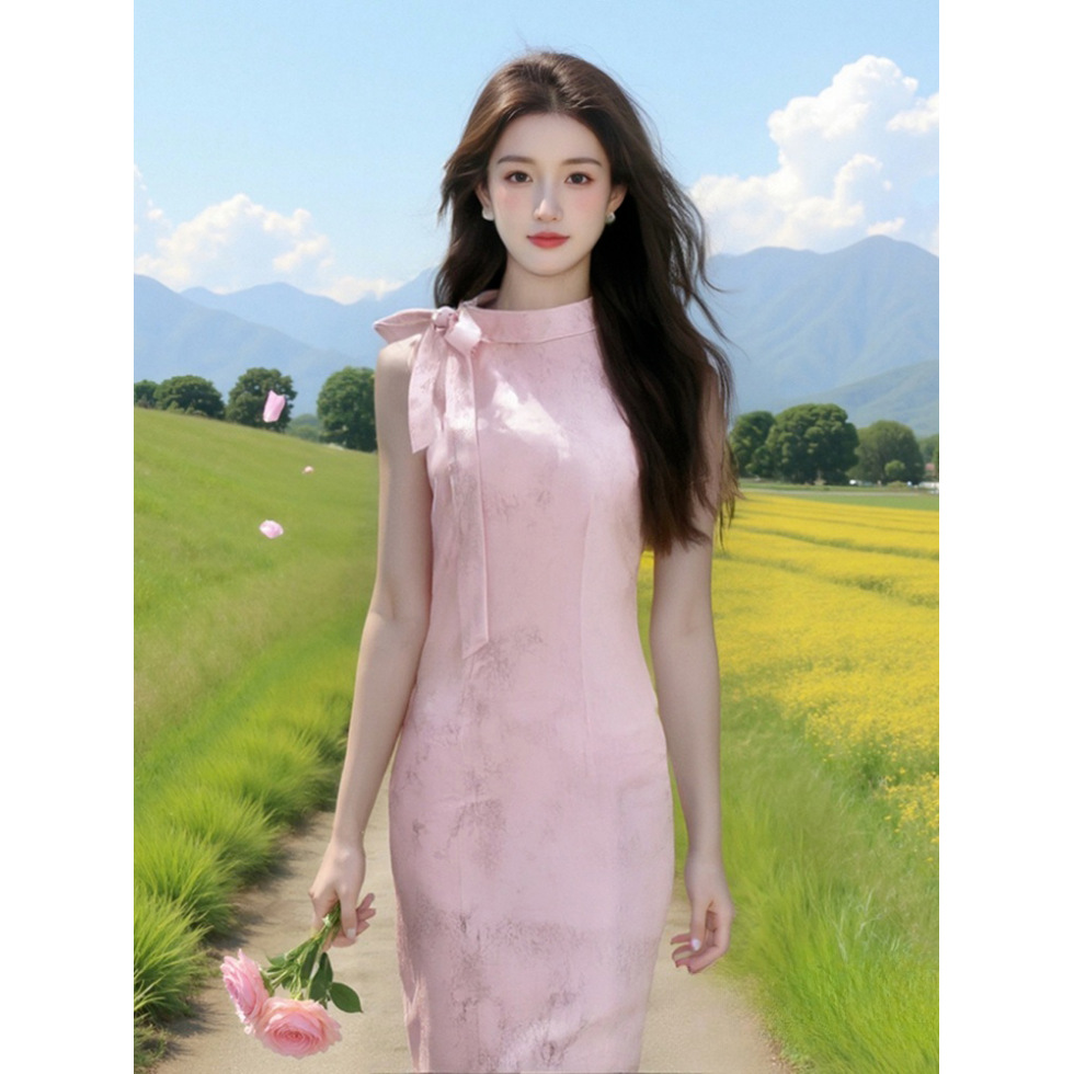 2025年夏季新中式女装粉色提花蝴蝶结挂脖旗袍漂亮独特国风连衣裙