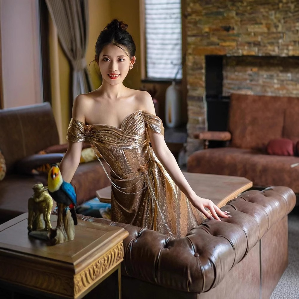 Gaun Malam Emas Model Baru 2025 Rok Pertunangan Pengantin Wanita Bahu Berkualitas Tinggi Pakaian Bersulang Perjamuan Elegan Tuan Rumah