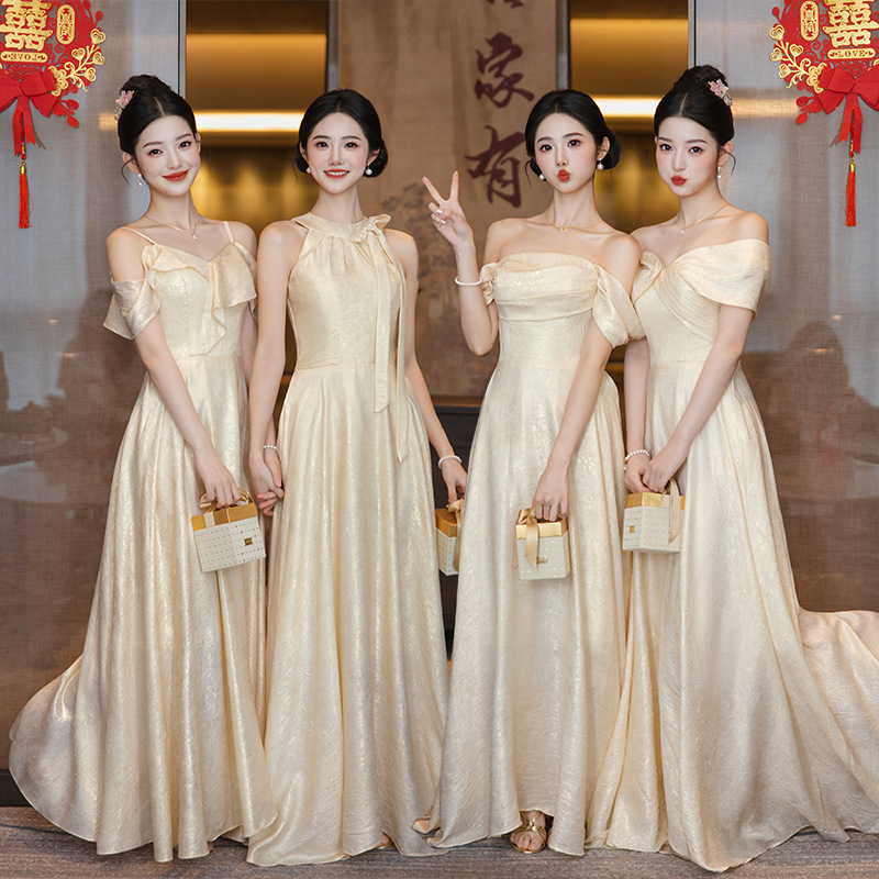 Gaun pengiring pengantin warna sampanye untuk wanita 2025, gaun malam Prancis musim gugur baru, gaya panjang khusus kelas atas seperti peri untuk kelompok saudara perempuan
