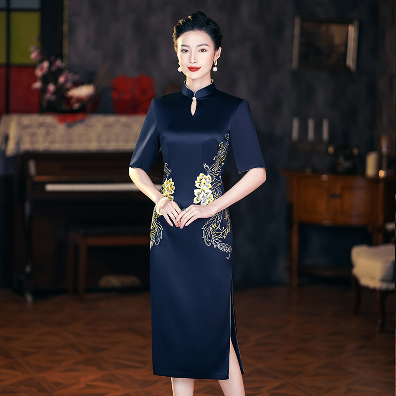 Cheongsam panjang bordir satin asetat gaya Cina baru untuk gaun perjamuan pernikahan ibu mertua, musim semi.