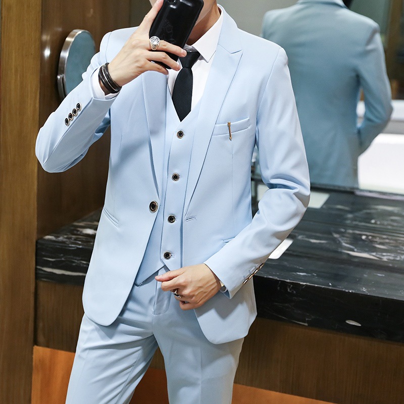 Setelan pakaian pria tiga potong, setelan jas tiga potong ringan, pakaian pengiring pengantin gaya Korea kasual, setelan bisnis pria untuk pernikahan