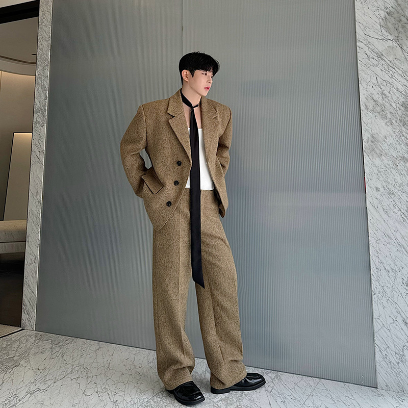 高级感时装中古老钱风粗纺休闲西服套装男秋冬气质宽松西装西裤