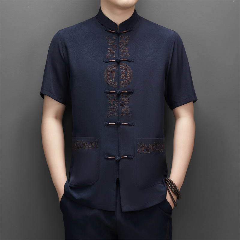 新款男士短袖唐装夏季衬衫立领复古宽松爸爸装中国风衬衣透气半袖