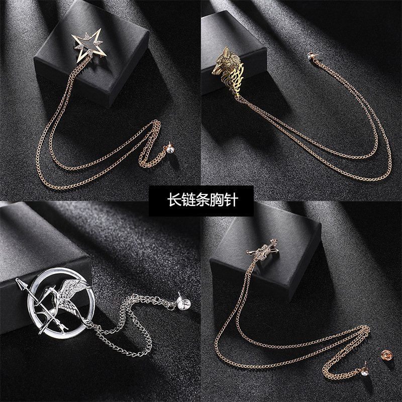 Setelan bros pria, setelan pin kerah bunga, korsase rantai panjang, aksesori gaun catwalk, pakaian pernikahan
