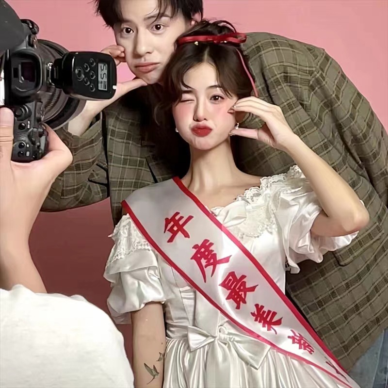 Xiaoongshu gaun pengantin kecantikan tahunan gaya yang sama dengan gaun pagi properti foto etiket spanduk kreatif dengan artefak ayun