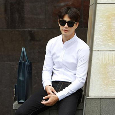Kemeja kerah berdiri untuk pria, kemeja pas badan lengan panjang gaya Korea kerah kecil, kemeja pernikahan kerah bulat warna putih trendi untuk pria