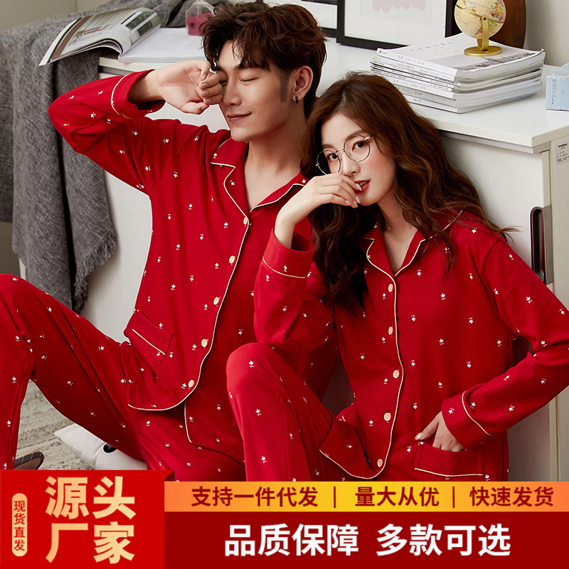 Piyama pasangan katun wanita lengan panjang pernikahan pengantin wanita pengantin laki-laki merah besar pernikahan meriah musim semi dan musim gugur setelan pria
