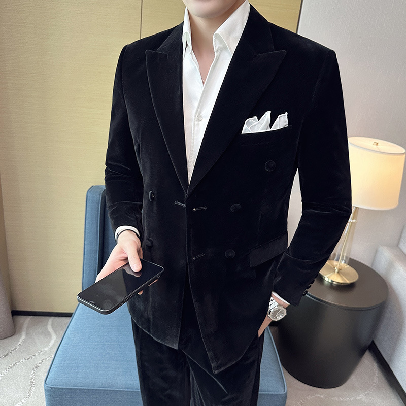 Tiktok setelan beludru hitam pria, setelan jas dua potong suede double-breasted, pakaian pernikahan pengantin pria, slim fit