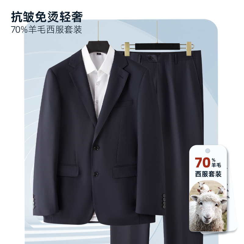 Setelan Jas Pria Bisnis Musim Gugur 2025, 70% Wol, Biru Dongker, untuk Pengantin Pria dan Pesta