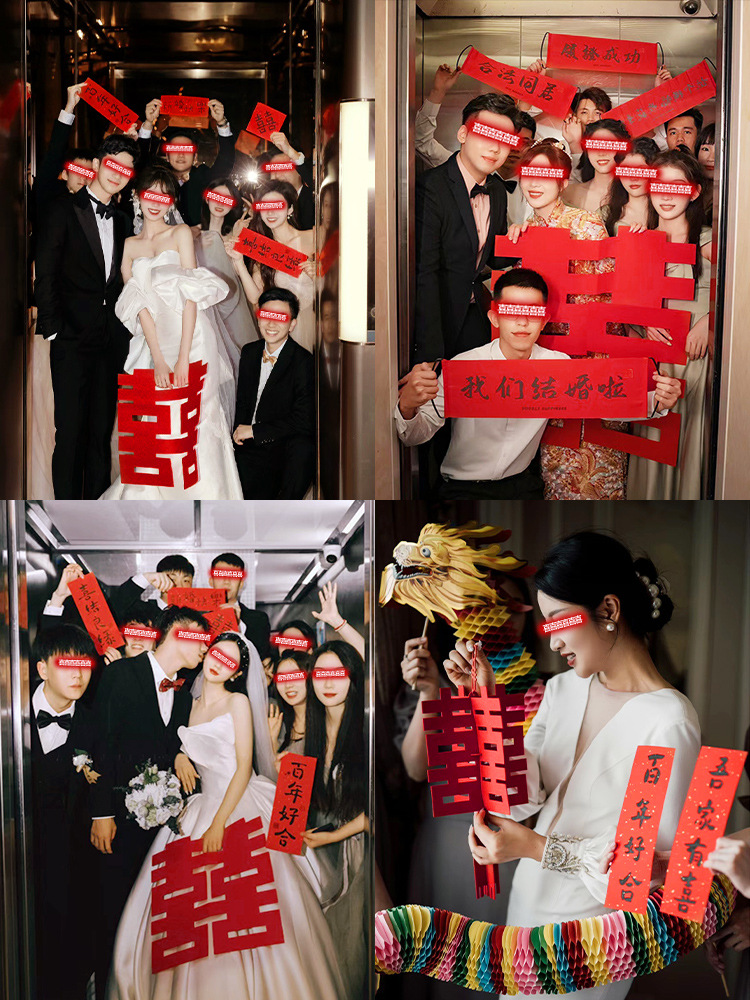 Gaun pagi pernikahan, properti fotografi pernikahan dan foto untuk dekorasi ruang pernikahan pengantin wanita Grup pengiring pengantin karakter Xi couplet kecil dekorasi