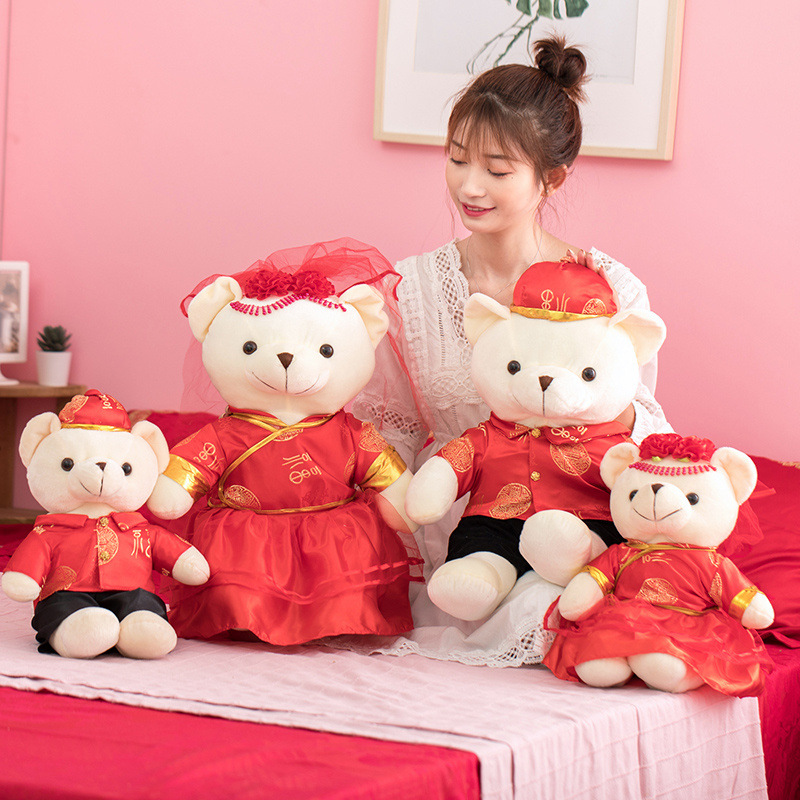 Boneka tekan tempat tidur beruang, sepasang boneka pasangan, mainan pernikahan ruang pernikahan, bantal kebahagiaan ganda