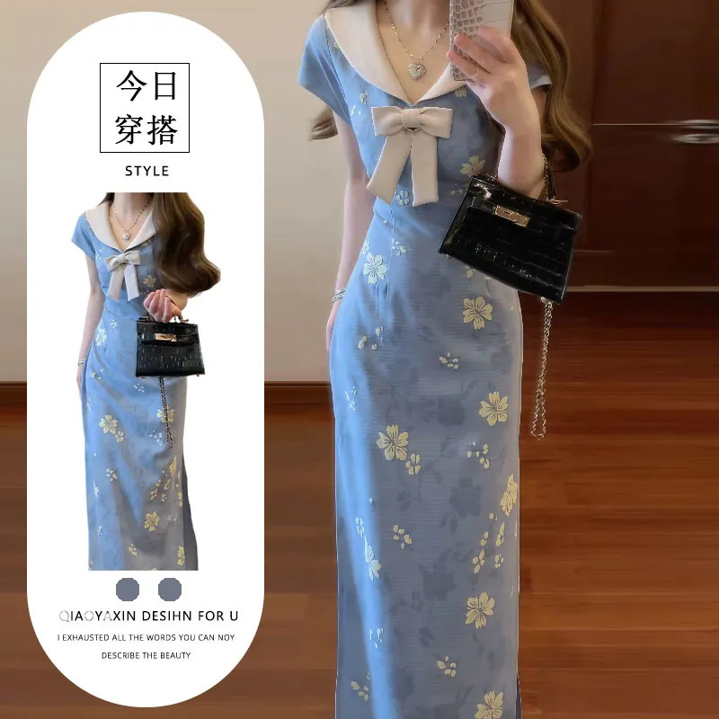 Gaun Cheongsam Modifikasi Kerah Boneka Gaya Tiongkok Baru Gaya Tiongkok Sedikit Gemuk untuk Dipakai di Musim Panas 2025 Rok Panjang Elegan Membentuk Pinggang