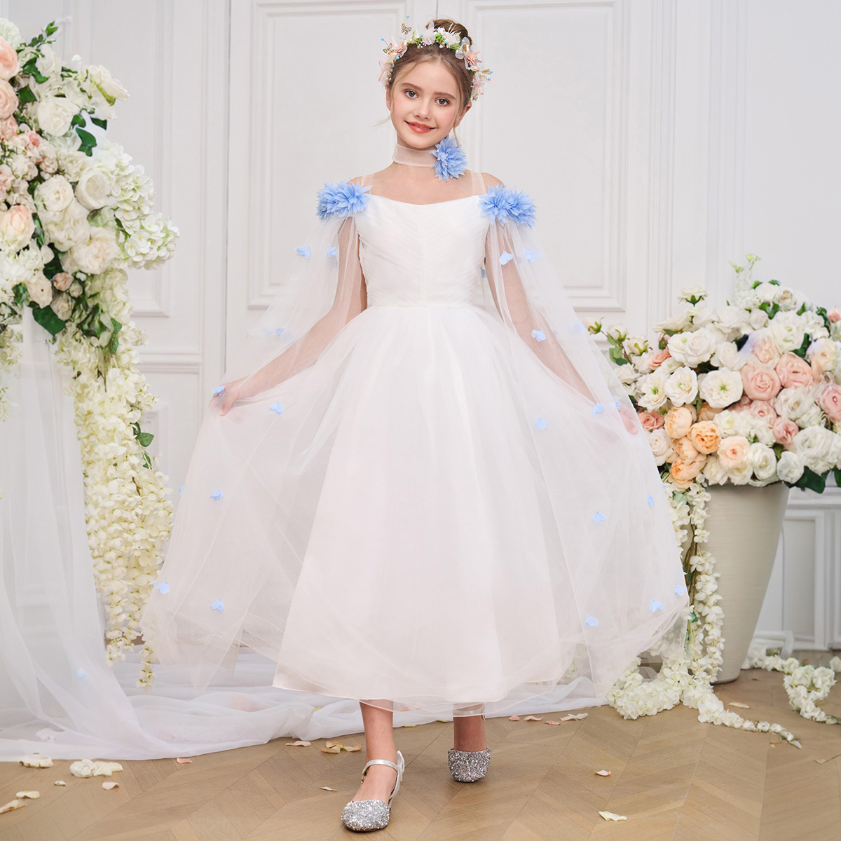 亚马逊新款中大童礼服立体小花系脖披风网纱蓬蓬裙小主持人晚礼服