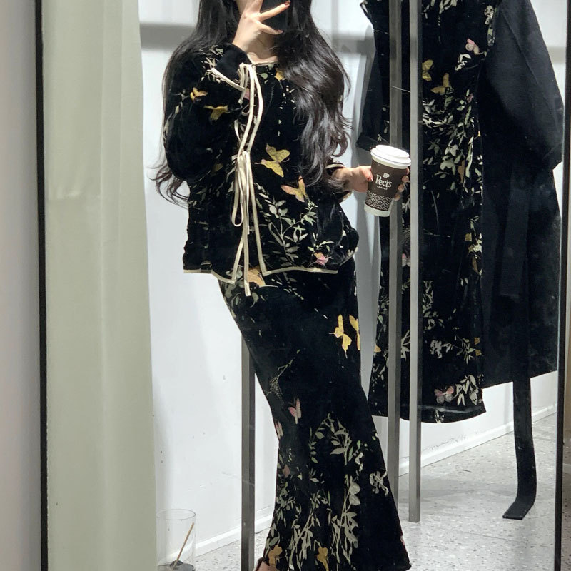 Ready stock from time jaket beludru hitam + setelan rok fishtail gaun cheongsam hitam tanpa lengan 202