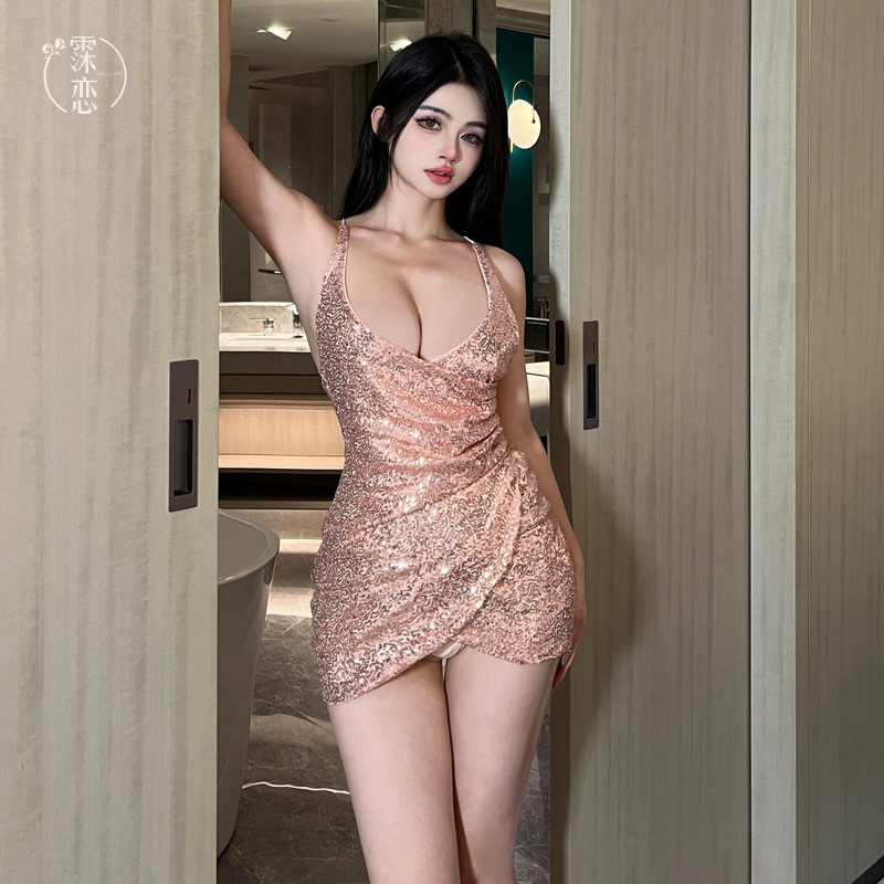 Pakaian dalam seksi tali silang berpayet V dalam seksi Love gaun malam punggung terbuka terbuka dada setelan klub malam