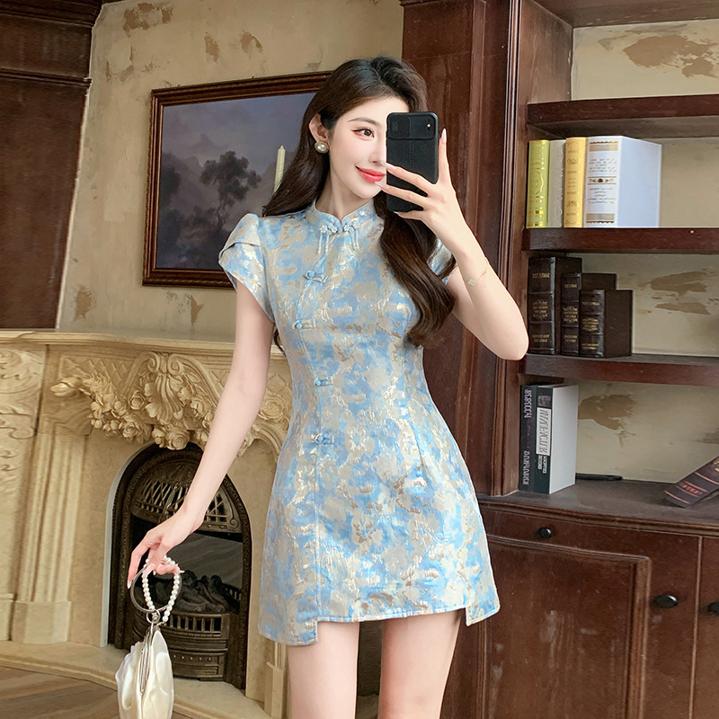 Cheongsam gaya Cina baru, versi yang ditingkatkan, desain baru yang modis, kerah tegak, lengan pendek, belahan, panjang sedang, gaya nasional, gaun gaya Miyake.