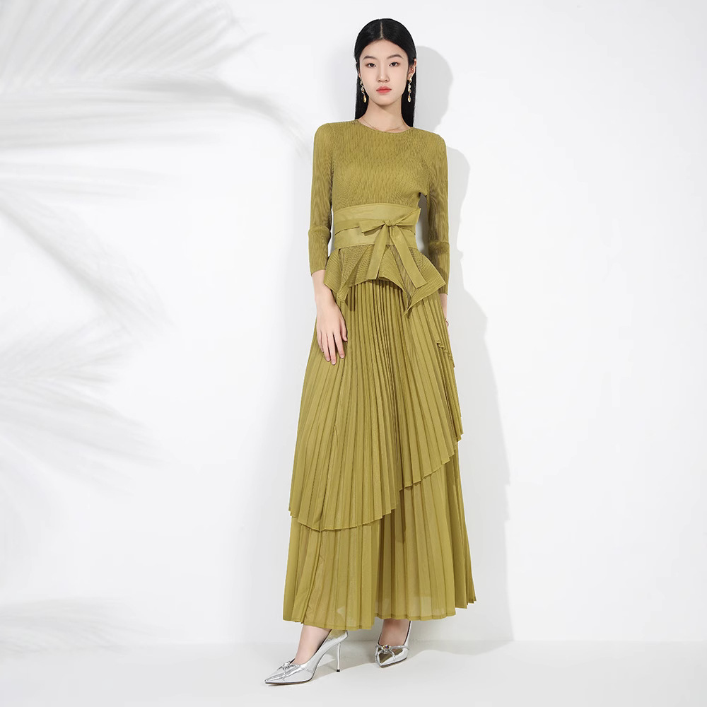 Gaun Malam Warna Polos Lipit Set Dua Potong Lengan Panjang Rok Setengah Pinggang Elastis Pinggang Atasan Baju Atasan Setelan Wanita Komuter Elegan