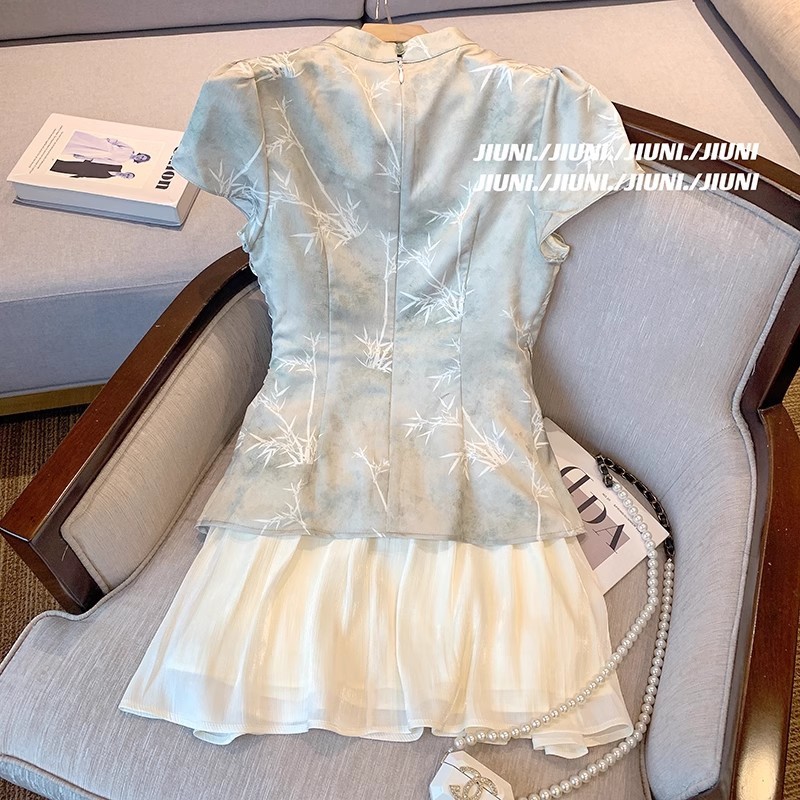 Gaun Dua Potong Palsu Cheongsam Modifikasi Gaya Tiongkok Baru Gaya Perancis Wanita Elegan Tidak Teratur Pinggang Musim Panas 2025