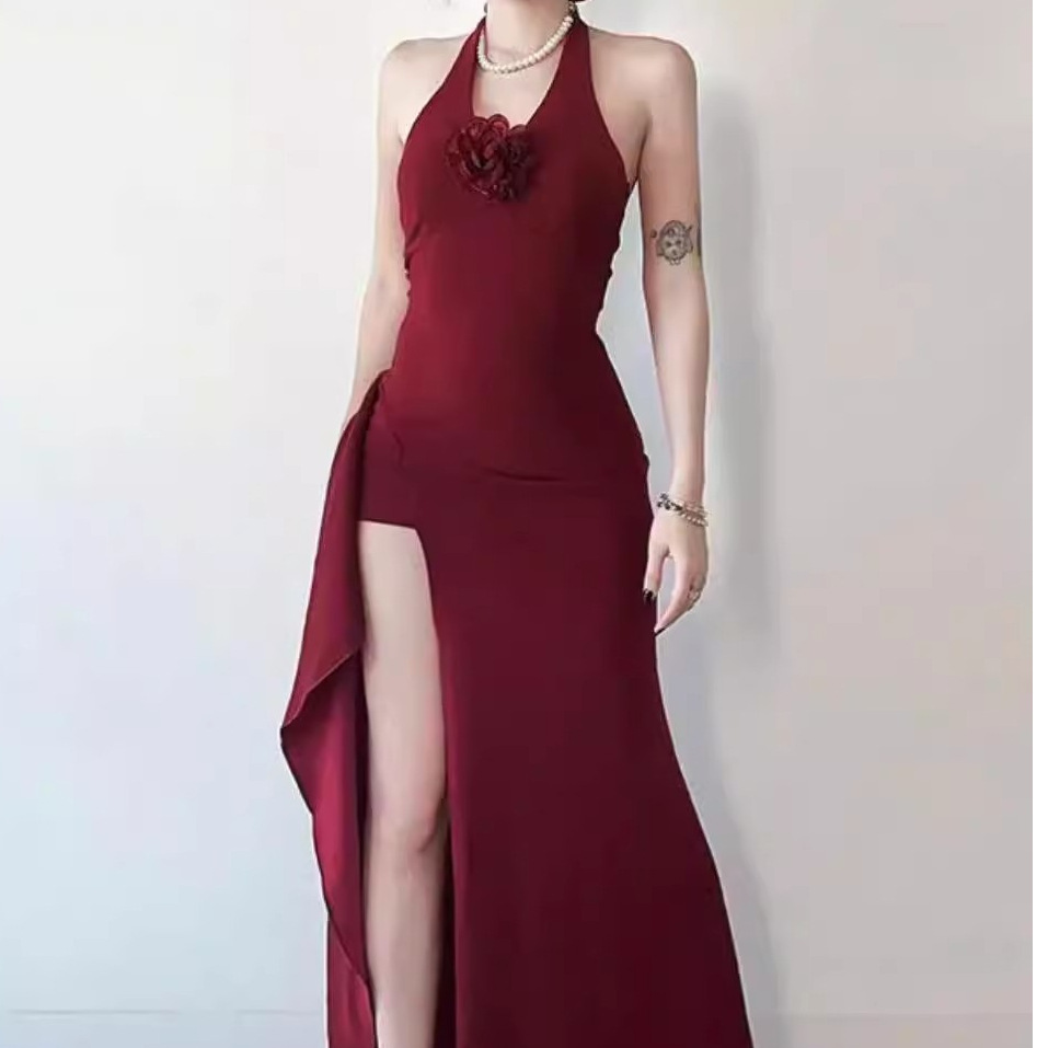 Gaun Keliman Tidak Beraturan Gantung Leher Logam Kerah V Seksi Eropa dan Amerika Rok Malam Punggung Terbuka Kelas Atas Gadis Pedas Elegan